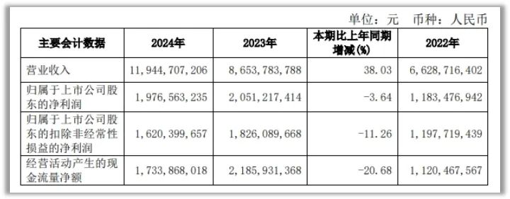 从2024年财务报告来看,营收和利润数据呈现出明显的背离。全年营收达到119.4亿元,同比增长38.03%,看似成绩斐然;然而,净利润却同比下滑3.64%,扣除非经常性损益的净利润更是下滑11.26%。