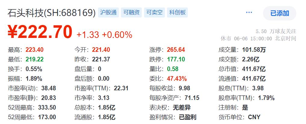 据悉,石头科技于2020年2月21日在A股上市,截至6月6日收市,每股收报222.70元,总市值约411.67亿元。
