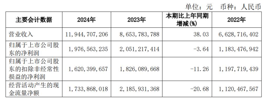 业绩方面,2024年,公司实现营业收入119.45亿元,同比增长38.03%;实现归属于母公司所有者的净利润19.77亿元,同比下降3.64%。