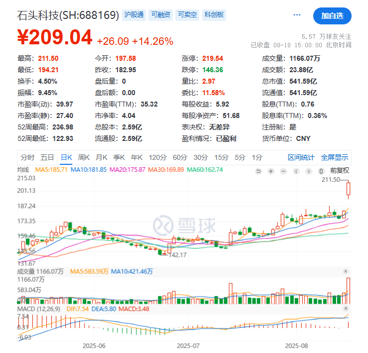 乐居财经李兰 8月18日,石头科技(688169.SH)股价涨14.26%,报209.04元/股,总市值为541.59亿元。