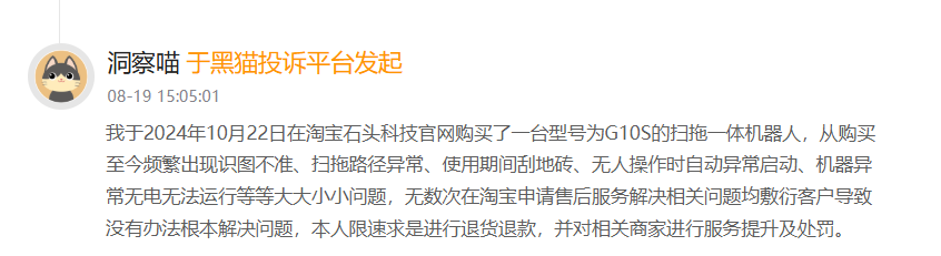 DoNews9月4日消息,8月19日,有消费者在黑猫平台投诉称,自己于2024年10月22日在在电商平台购买了一台石头科技型号为G10S的扫拖一体机器人,从购买至今频繁出现识图不准、扫拖路径异常、使用期间刮地砖、无人操作时自动异常启动、机器异常无电无法运行等等大大小小问题,无数次申请售后服务解决相关问题,然而售后均敷衍客户,导致没有办法根本解决问题,现在消费者本人要求进行退货退款,并对相关商家进行服务提升及处罚。
