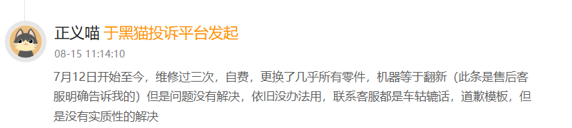 8月15日,有消费者在黑猫平台投诉称,自己花4396元购买了一台石头科技扫地机器人,7月12日开始至今已经维修过三次,都是自费,更换了几乎所有零件,机器等于翻新(是售后客服明确告诉消费者的),但是问题没有解决,产品依旧没办法用,联系客服都是车轱辘话,道歉模板,没有实质性的解决任何的问题。