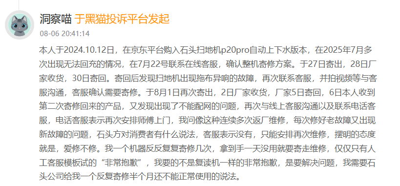 8月6日,有消费者在黑猫平台投诉称,自己于2024年10月12日,在电商平台购入石头扫地机P20 Pro自动上下水版本,在2025年7月多次出现无法回充的情况,在7月22号联系在线客服,确认整机寄修方案。