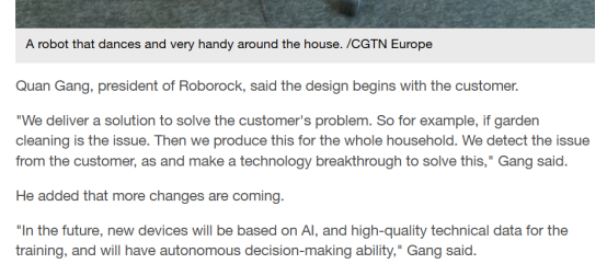 公司总裁也接受了CGTN 央视国际频道的采访,从采访内容看,石头科技机器人及AI属性将进一步增强
