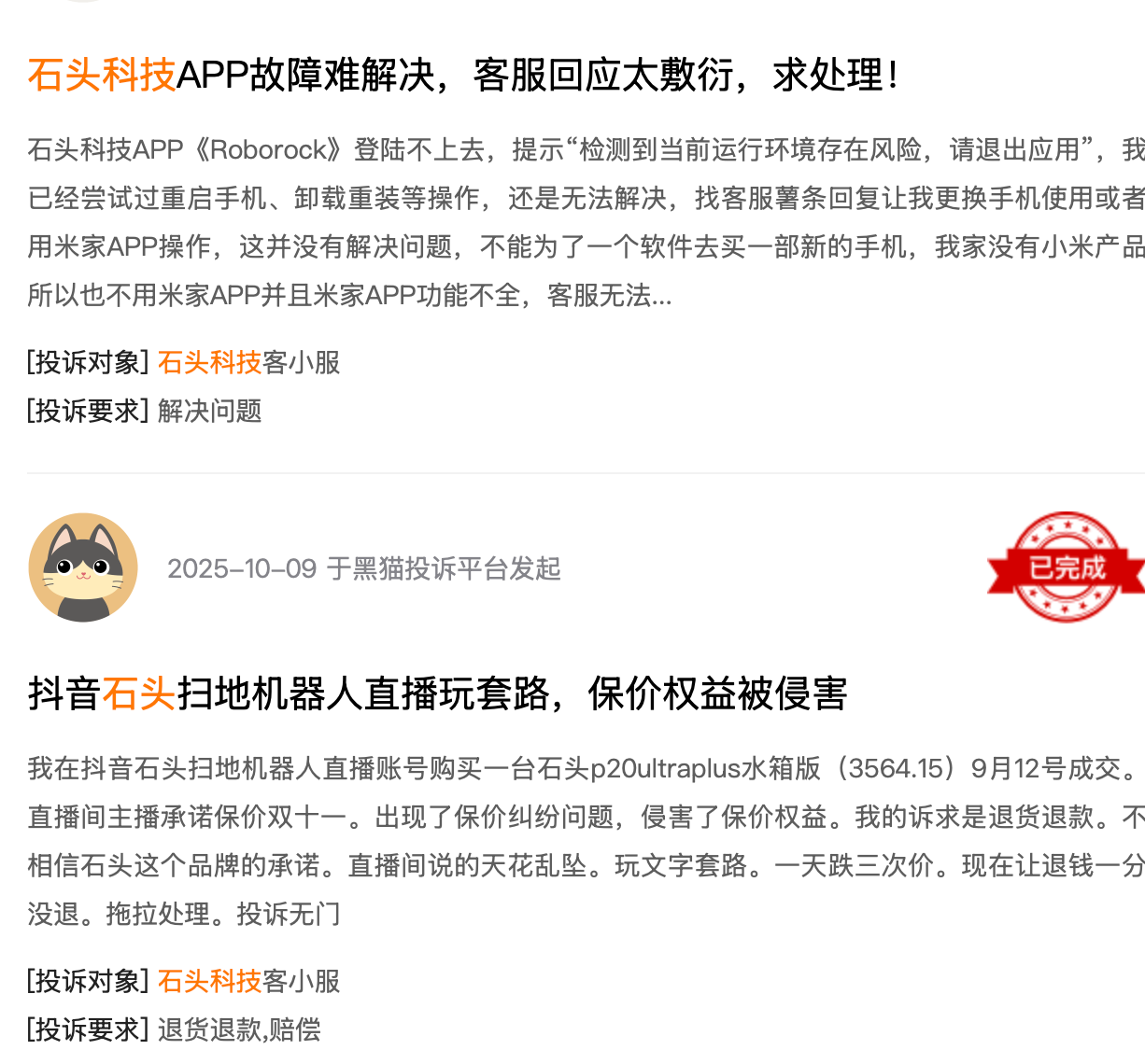 黑猫投诉平台数据显示,与“石头科技”相关的投诉量已超过2700条,问题集中在产品质量与售后服务。