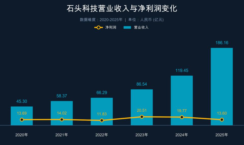 不过在业绩方面,石头科技的营业收入仍保持在较高的增速,业绩快报显示,石头科技 2025 年实现营收 186.16 亿元,创下历史新高,同时根据其公告援引的 IDC 最新报告数据,石头科技智能扫地机器人在全球市场上的销售额及销量份额居全球第一。