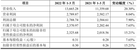2022年1-3月,公司营业收入为13,665.28万元,同比增长20.30%;归属于母公司股东的净利润2,370.97万元,同比增长7.65%;归属于母公司股东的扣除非经常性损益后的净利润2,325.68万元,同比增长15.21%;经营活动产生的现金流量净额-1,898.59万元,同比减少391.35%。