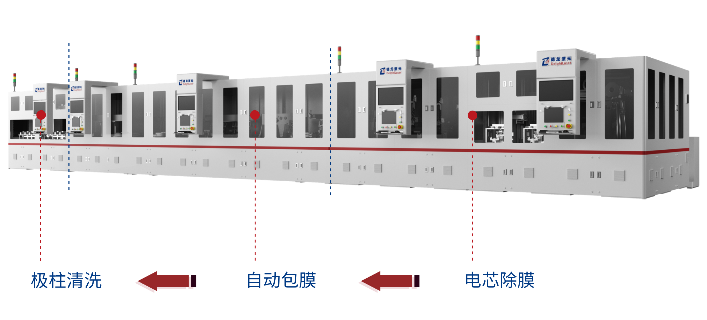 在动力锂电池的生产过程中,无法避免会出现返工制程。针对锂电池电芯返工制程中电芯结构胶去除、电芯撕膜、自动包膜、极柱清洗全套制程,德龙激光自主研发电芯返工全流程产线,开发了电芯激光除膜设备、电芯自动包膜设备及电芯极柱激光清洗设备为电芯返工全制程提供激光解决方案。