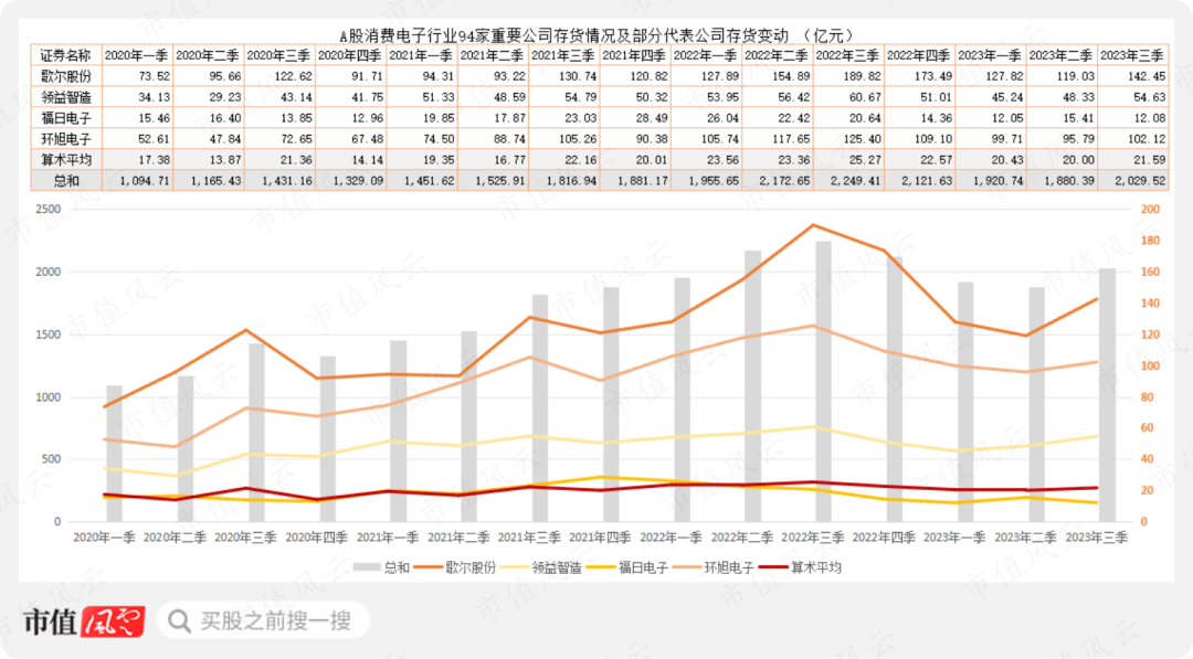 同期,消费电子行业代表公司之一的歌尔股份(002241.SZ)存货在三季度末较年初(2022年四季度末)减少31亿元,环旭电子(601231.SH)减少了7亿元。