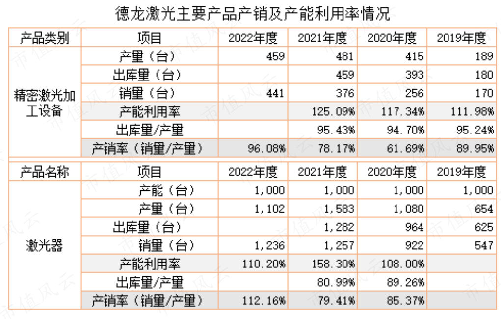 德龙激光IPO项目主要是扩产能,截止2021年底,德龙激光的精密激光设备和激光器的产能利用率均超过100%,似乎,产能成为该公司营收增长主要瓶颈;激光设备、激光器这两大产品的产销率也处于较高水平,2022年分别为96%、112%。随着募投项目的建成投产,产能将大幅增加。