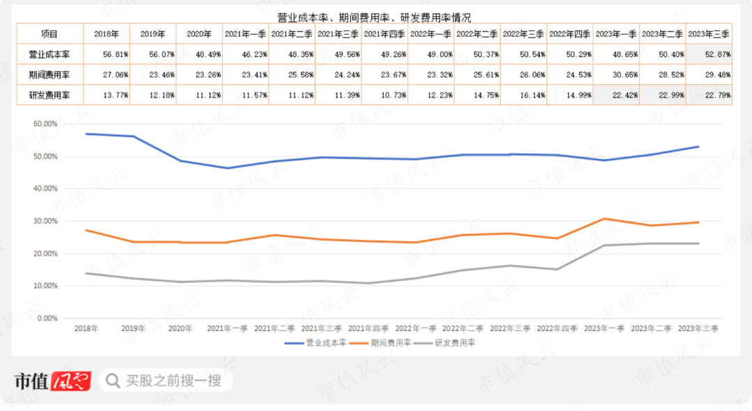 该公司的亏损是多方面导致的,2023年一季度至三季度,营业成本率、期间费用率以及研发费用率都在上升。