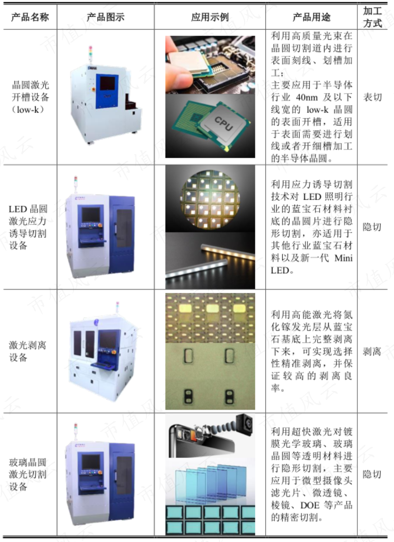 主要产品包括半导体及光学激光加工设备、显示激光加工设备、消费电子激光加工设备等,已应用于碳化硅、氮化镓等第三代半导体材料晶圆划片、MEMS 芯片的切割、Mini LED 以及 5G天线加工等。