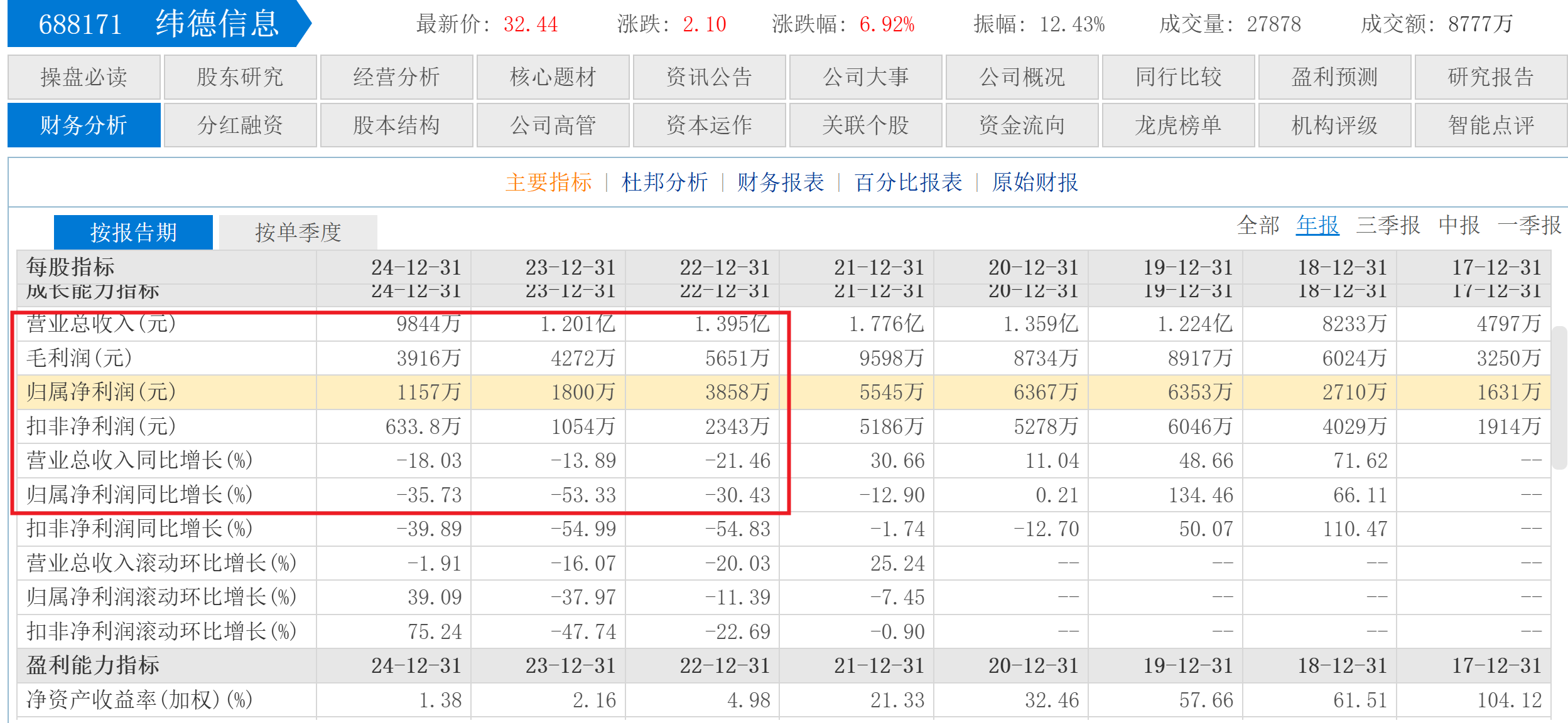 2022年1月,纬德信息科创板上市。纬德信息发布的2024年财报显示,公司全年实现营业收入9,843.78万元,同比下降18.03%;实现归属于母公司所有者的净利润1,157.13万元,同比下降35.73%。2025年第一季度,该公司实现营业收入890万元,归母净利润为-96万元。