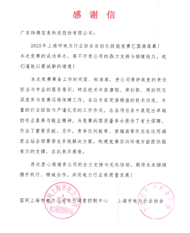 近日,纬德信息收到国家电网上海市电力公司电力调度控制中心以及上海市电力行业协会发来的感谢信,对纬德信息在2025年上海市电力行业自动化技能竞赛中所提供的专业支持与保障服务表示诚挚谢意。