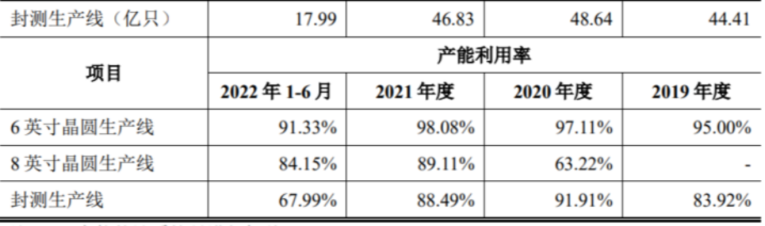 公司2022上半年的6英寸晶圆生产线、8英寸晶圆生产线、封测生产线的产能利用率分别为91.33%、84.15%、67.99%,均较2021年有明显下滑。