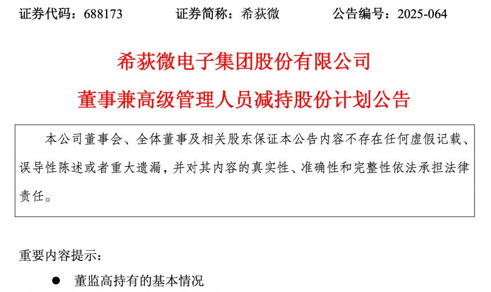8月11日晚间,希荻微(688173.SH)发布公告称,公司董事、副总经理兼核心技术人员范俊先生计划通过集中竞价交易方式,减持其持有的公司股份不超过300万股,占公司总股本的0.73%。