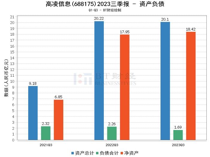 在资产负债方面,2023年三季度末,高凌信息的总资产为20.1亿元,相比上年度末的20.08亿元微增0.10%。负债合计为1.69亿元,相比上年度末的1.64亿元有所增加。净资产为18.42亿元,相比上年度末的18.44亿元略有下降。资产负债率为8.38%,相比上年度末的8.17%有所上升。