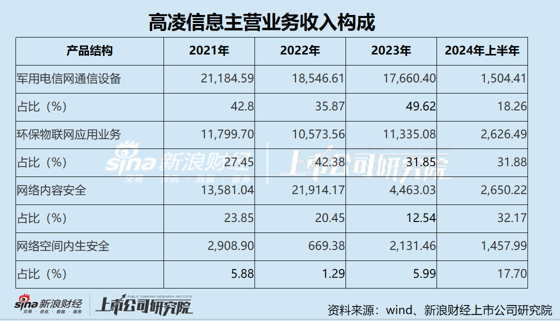 按业务结构来看,2024年1-6月,军用电信网通信设备收入同比大降86.68%,仅1504.41万元,2023年同期为1.13亿元,收入占比从68.44%降至18.26%。与之相对的,网络内容安全业务收入同比增长67.34%至2650.22万元,一举成为第一大业务。环保物联网应用业务收入为2626.49万元,仅次于网络内容安全业务,收入占比从18.56%上升至31.88%。