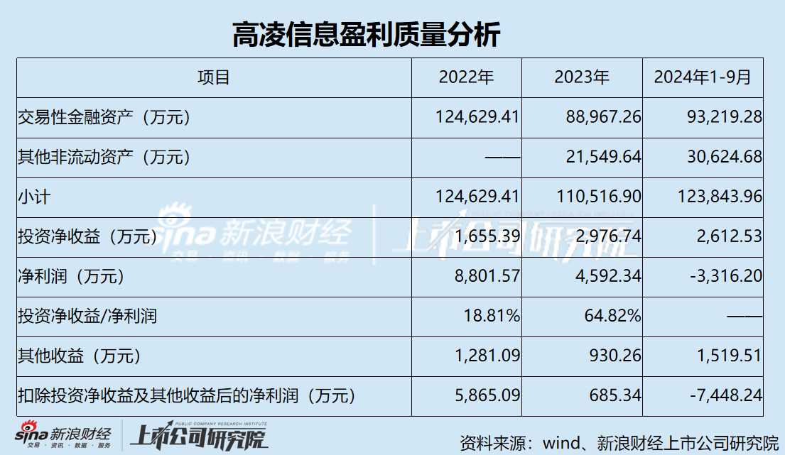 2022年至今年前三季度,公司投资净收益分别为1655.39万元、2976.74万元和2612.53万元,分别同比增长172.13%、79.82%和50.32%,分别占当期净利润的18.81%、64.82%和-78.78%。若扣除投资净收益及其他收益(主要系政府补助),各期净利润分别为5865.09万元、685.34万元和-7448.24万元,盈利质量堪忧。