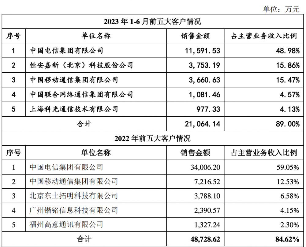 欣诺通信招股说明书显示,2020年-2022年,其前五大客户收入占当期主营业务收入的比例分别为 58.65%、72.73%及 84.62%。另外,中国电信、中国移动一直为前两大客户,对二者销售收入占当期主营业务收入的合计比例分别为46.79%、55.57%及 71.58%。