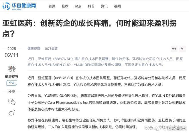 公告显示,YUSHEN GUO因退休,未来将以高级技术顾问身份继续提供技术指导,而YIJUN DENG则聚焦于子公司MetCura Pharmaceuticals Inc.的抗感染领域研发。亚虹医药强调,此次调整不会对公司的研发体系及核心技术构成重大不利影响。