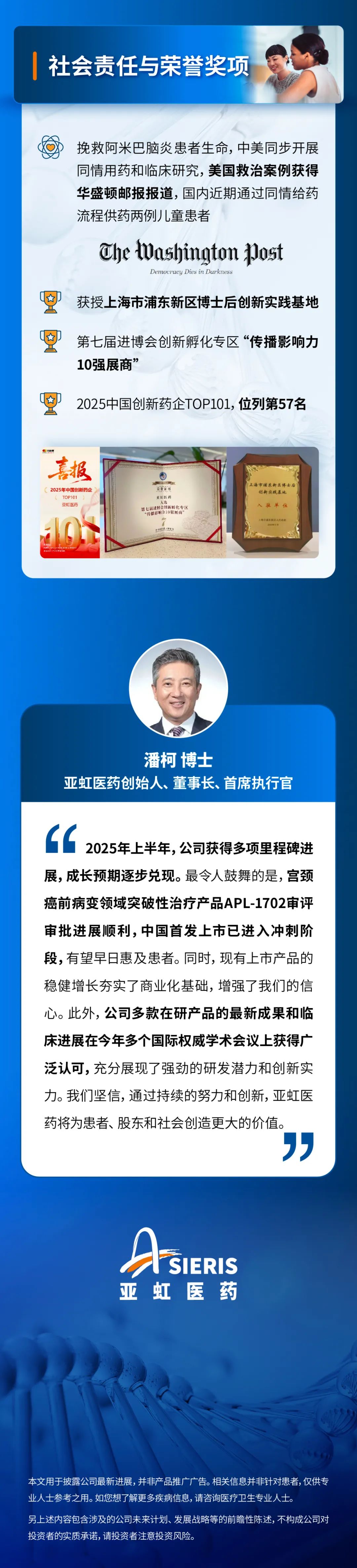 亚虹医药(股票代码:688176.SH)成立于2010年3月,是一家专注于泌尿生殖系统肿瘤及女性健康领域的全球化创新药公司。秉承“改善人类健康,让生命更有尊严”的企业使命,亚虹医药立志成为在专注治疗领域集研发、生产和商业化为一体的国际领先制药企业,为中国和全球患者提供最佳的诊疗一体化解决方案。