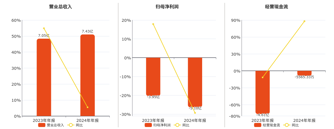 公司营业总收入为7.43亿元。归母净利润为-5.10亿元,较去年同报告期归母净利润减少1.16亿元。经营活动现金净流入为-5565.33万元。