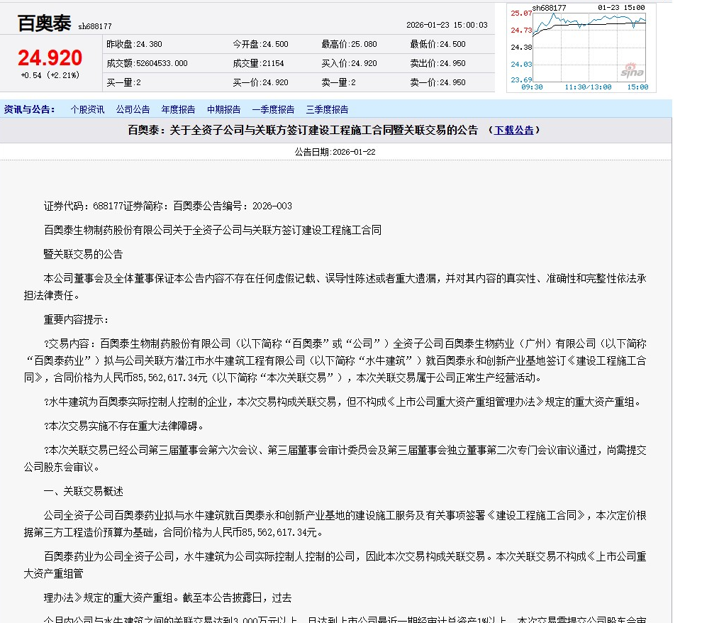 如果说上市前的操作是“存量分配”,那么上市后的关联交易则是“增量输送”。在百奥泰的公告序列里,“潜江市水牛建筑”是一个无法绕过的名字。从 2021 年至今,这家带着浓郁乡情色彩的建筑商,几乎承包了百奥泰所有的基建梦想: