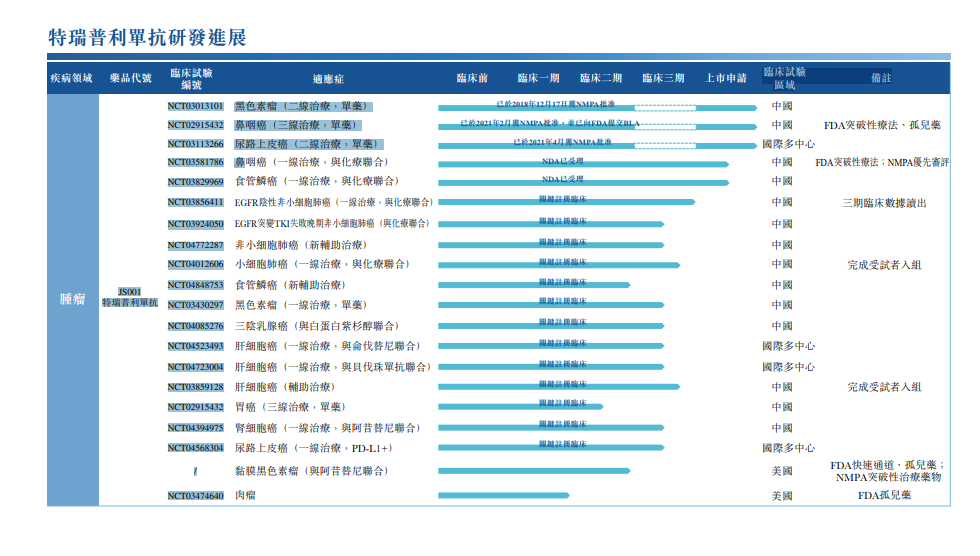 此外,2021年2月,君实已授权给Coherus公司在美国和加拿大的独占许可,以及两个早期阶段检查点抑制剂抗体药物的优先谈判权,并可获得合计最高达11.1亿美元的首付款、可选项目执行费和里程碑付款。