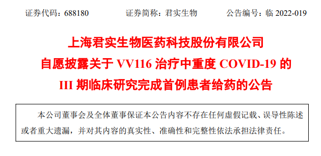 另外,针对轻中度 COVID-19,公司与旺山旺水还启动了一项国际多中心、双盲、随机、安慰剂对照、II/III 期临床研究(NCT05242042),旨在评价 VV116 用于轻中度 COVID-19 患者早期治疗的有效性、安全性和药代动力学,主要终点为 29 天内转重症/危重症 COVID-19 及全因死亡的患者比例。截至本公告披露日,该研究已在上海市公共卫生临床中心完成首例患者入组及给药,正在全球多个中心开展中。