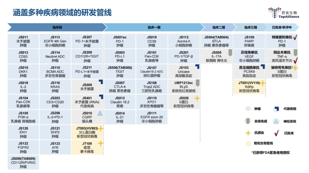 截至目前,君实生物拥有超过51项在研产品,覆盖五大治疗领域,包括恶性肿瘤、自身免疫系统疾病、慢性代谢类疾病、神经系统类疾病以及感染类疾病。