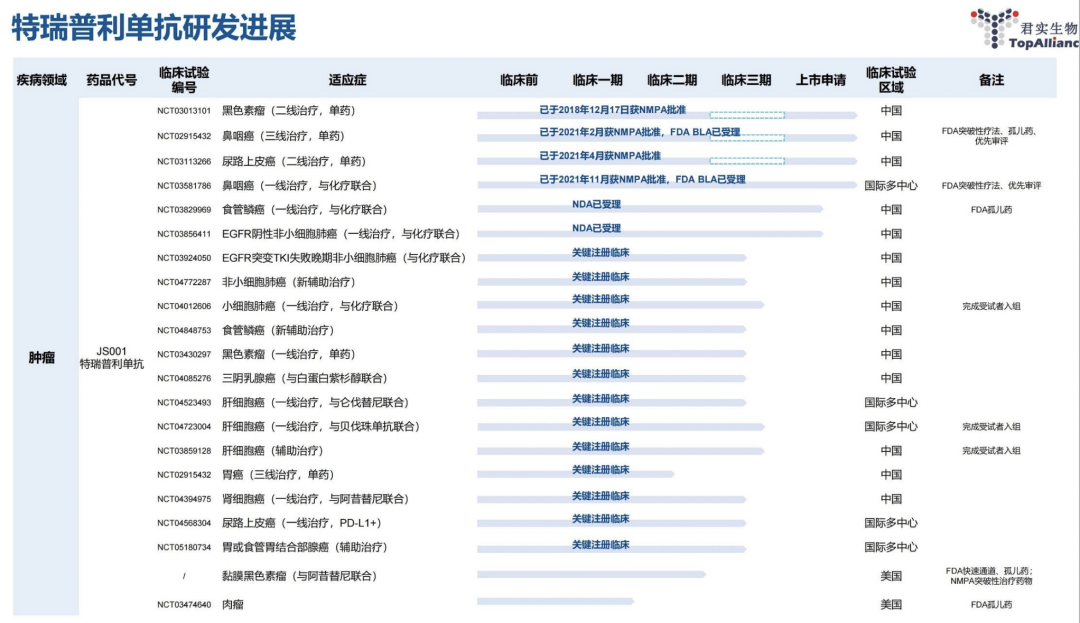 其实,打开君实PD-1研发管线来看,就会让人更加疑惑:两项适应症获FDA突破性疗法认证、3期临床超过10项、也不缺乏独家适应症,但却眼睁睁被同辈甩下,甚至被后来者居上。