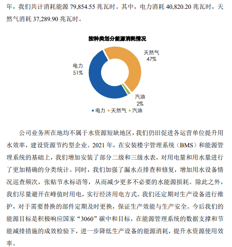 首先,在环境(E)责任信息披露方面,虽然君实生物披露的信息涵盖了资源使用、排放物管理以及气候变化应对多方面,但都只是在目标与理论层面的泛泛而谈,缺乏具体的定量数据披露以及详细的管治方案。以资源使用为例,君实生物在报告中只简单描述了其生产过程中对水资源、天然气、电力以及汽油等资源的使用情况,以及公司响应国家“3060”碳中和目标的决心,但根据港交所《ESG指引》,其对环境层面信披的要求远不止于此,诸如按类型划分的直接及╱或间接能源(如电、气或油)总耗量及密度、企业所订立的用水效益目标及为达到这些目标所采取的步骤等均为需要披露的信息。