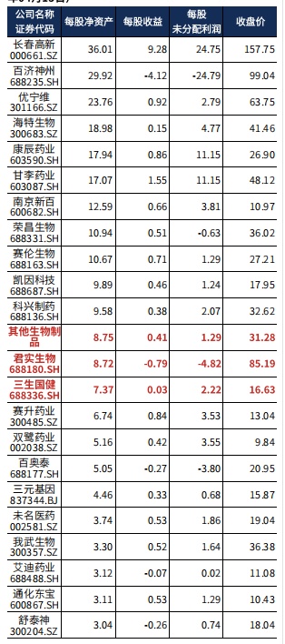 图表:其他生物制品每股指标排名(已披露2021年报企业)