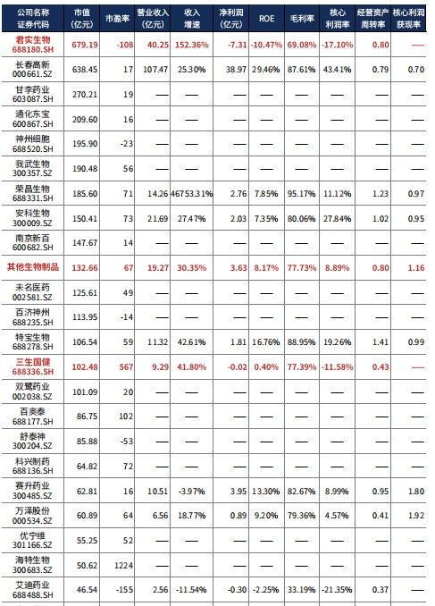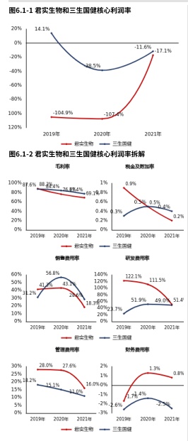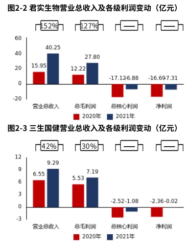 2021年报君实生物核心利润持续亏损,三生国健核心利润持续亏损。
