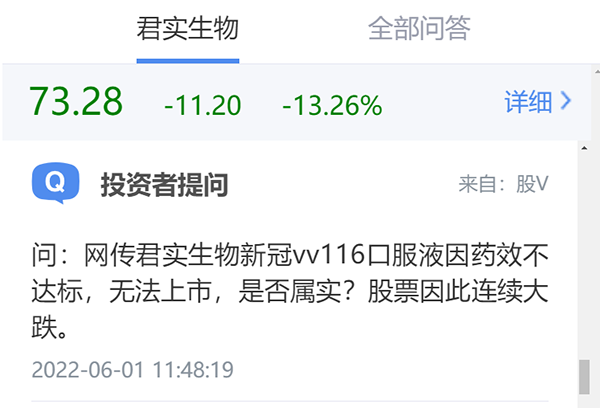今日,有投资者在投资者互动平台提问“网传君实生物新冠vv116口服液因药效不达标,无法上市,是否属实?股票因此连续大跌。”