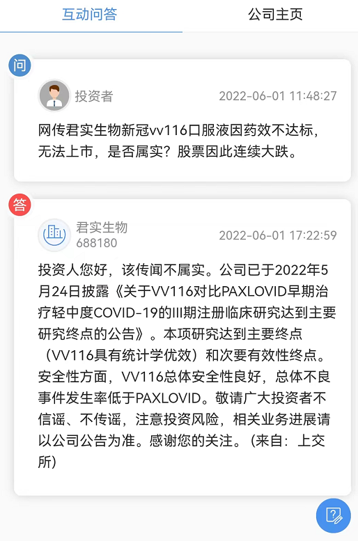 君实生物其后在互动平台中表示,有关传闻不属实。公司又指,在安全性方面,VV116总体安全性良好,总体不良事件发生率低于PAXLOVID,敬请广大投资者不信谣、不传谣,注意投资风险,有关业务进展以公司公告为准。