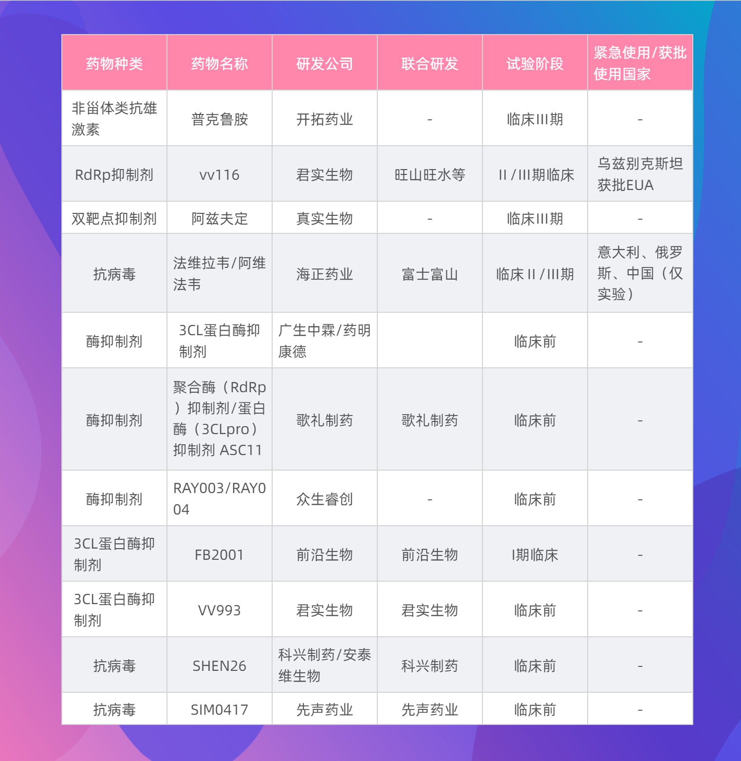 在研发进度上,国内以新冠口服药为代表的新冠药物研发已进入冲刺阶段。据中航证券5月28日研报梳理,目前我国新冠口服药项目已有4个进入临床Ⅲ期,其中国产新冠口服药有3款,分别是真实生物的阿兹夫定、君实生物的VV116和开拓药业(09939.HK)的普克鲁胺,其中后两者均已披露过临床数据。