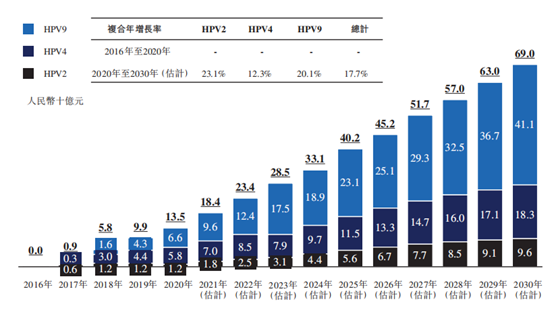 中国HPV疫苗市場产值,2016年至2030年(估计)图片来源:瑞科生物招股说明书