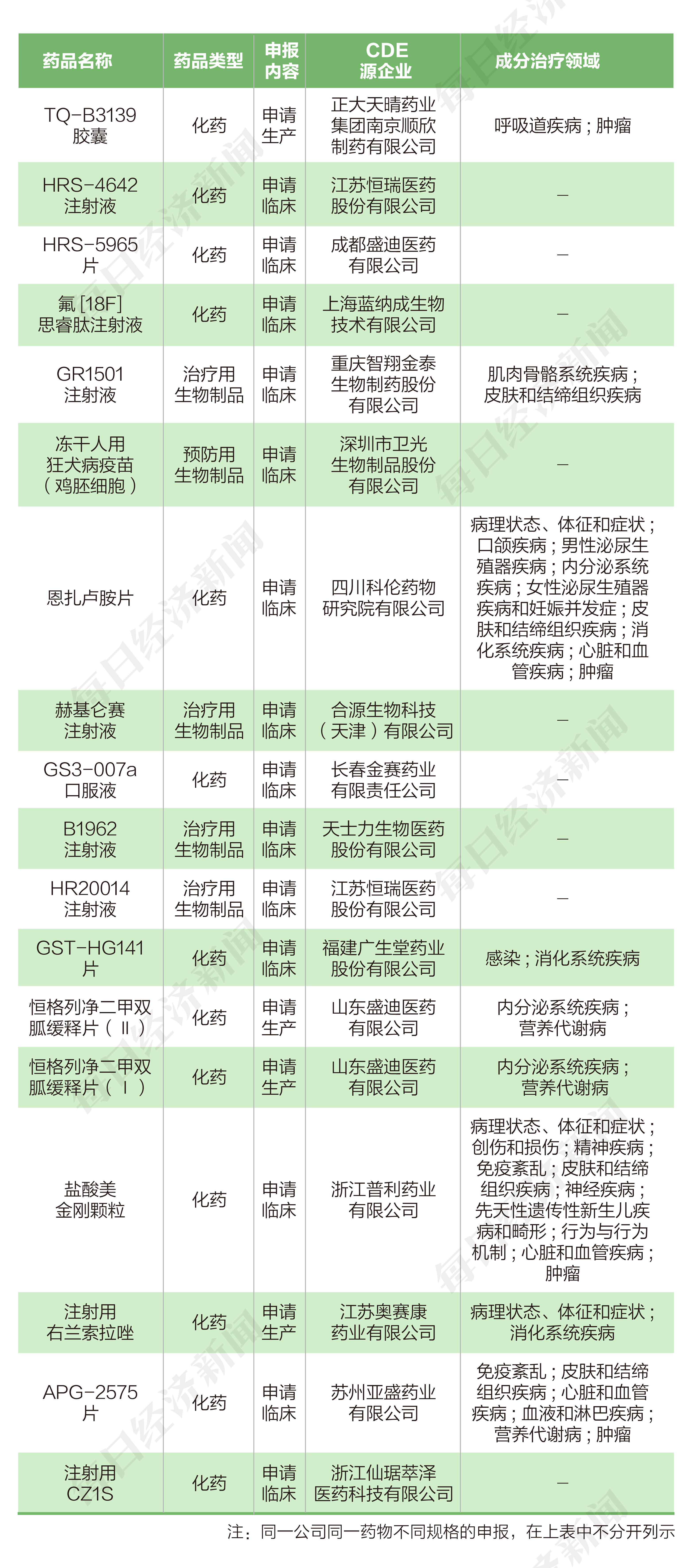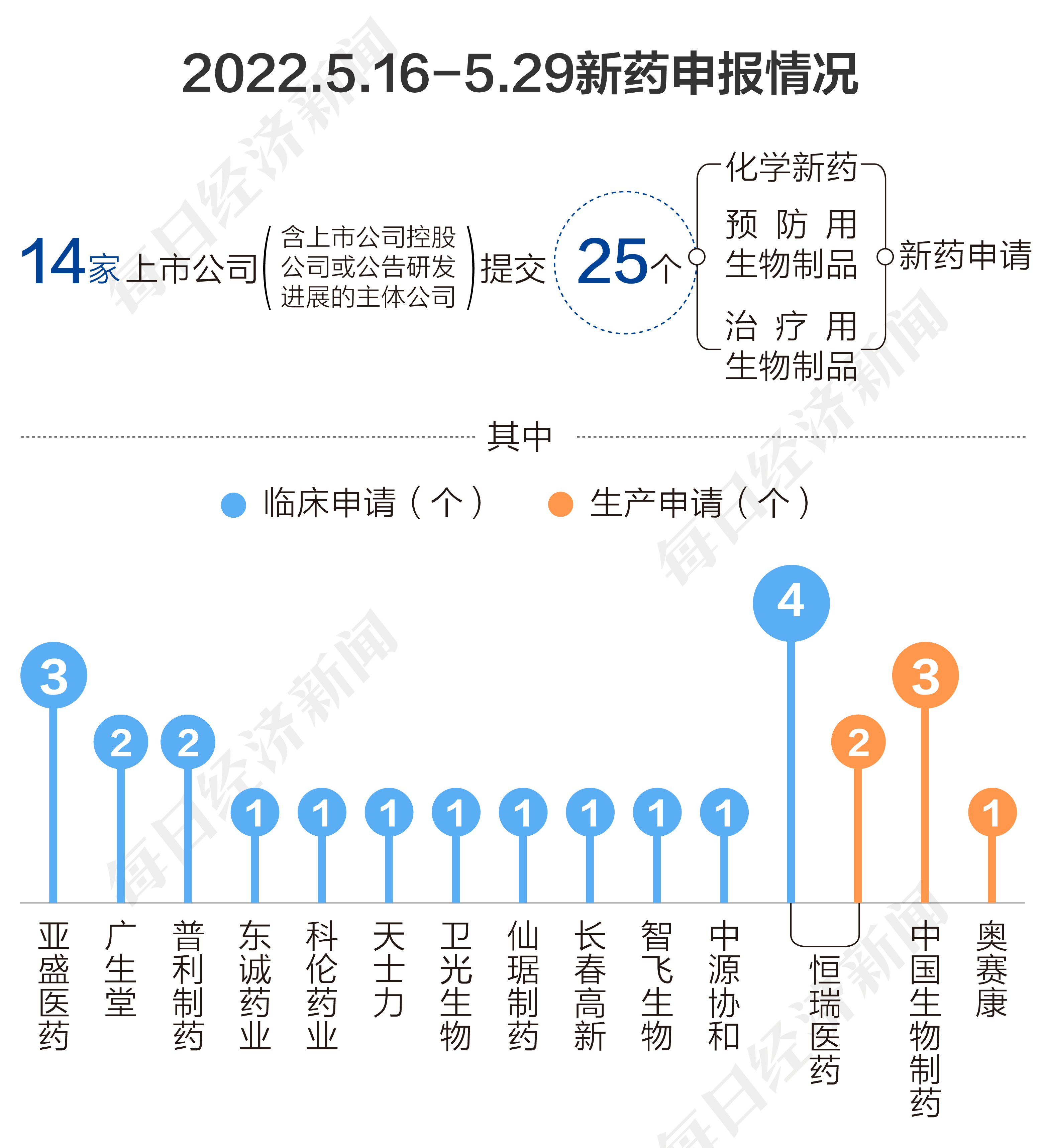 2022年5月16日至5月29日期间,上市公司方面,恒瑞医药(600276.SH)申报2个生产申请和4个临床申请,中国生物制药(01177.HK)申报3个生产申请,奥赛康(002755.SZ)申报1个生产申请;亚盛医药(06855.HK)申报3个临床申请,广生堂(300436.SZ)和普利制药(300630.SZ)分别申报2个临床申请,东诚药业(002675.SZ)、科伦药业(002422.SZ)、天士力(600535.SH)、卫光生物(002880.SZ)、仙琚制药(002332.SZ)、长春高新(000661.SZ)、智飞生物(300122.SZ)、中源协和(600645.SH)分别申报1个临床申请。