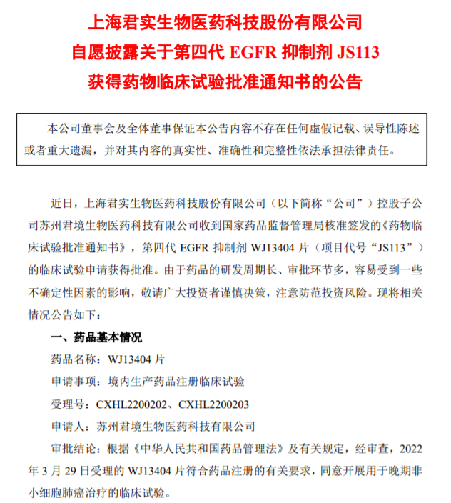 6月13日,君实生物宣布,其第四代EGFR抑制剂WJ13404片(JS113)?的临床试验申请获得批准,用于晚期非小细胞肺癌治疗。
