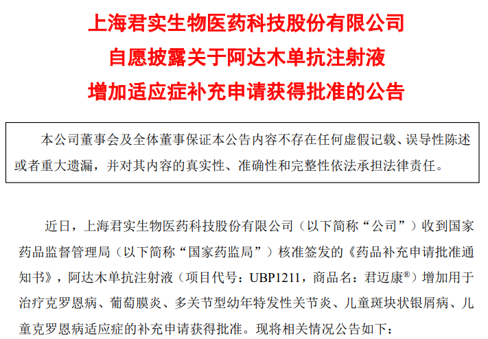 君实生物11月21日晚间公告,收到国家药品监督管理局核准签发的《药品补充申请批准通知书》,阿达木单抗注射液(项目代号:UBP1211,商品名:君迈康)增加用于治疗克罗恩病、葡萄膜炎、多关节型幼年特发性关节炎、儿童斑块状银屑病、儿童克罗恩病适应症的补充申请获得批准。
