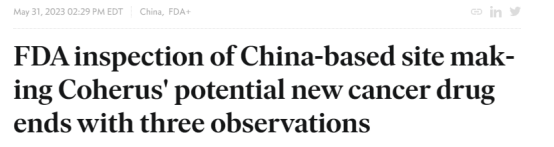 Coherus在提交给SEC的文件中表示:“公司认为,在FDA检查结束时收到的三项意见是可以解决的,并计划与君实生物一起在6月初向FDA提交答复。”不过该公司没有披露这些观察结果。