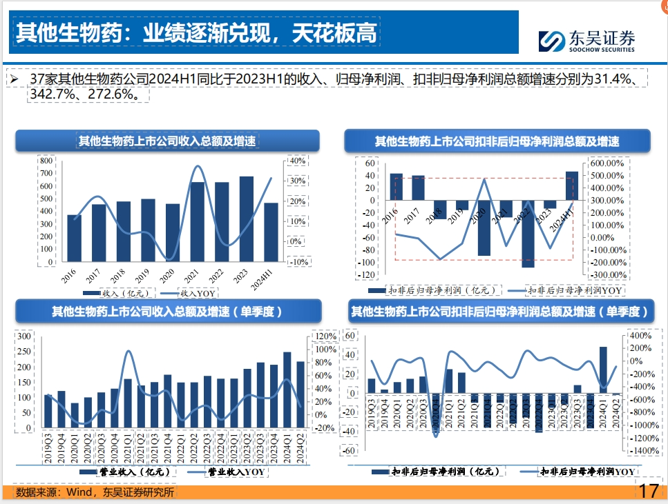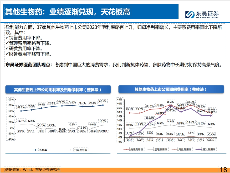 另据东吴证券数据,2024上半年37家其他生物药公司收入及归母净利润总额增速分别为31.4%、342.7%,毛利率增长的同时销售、管理、研发、财务等主要费用率同比下降,使得企业盈利能力有所提高。