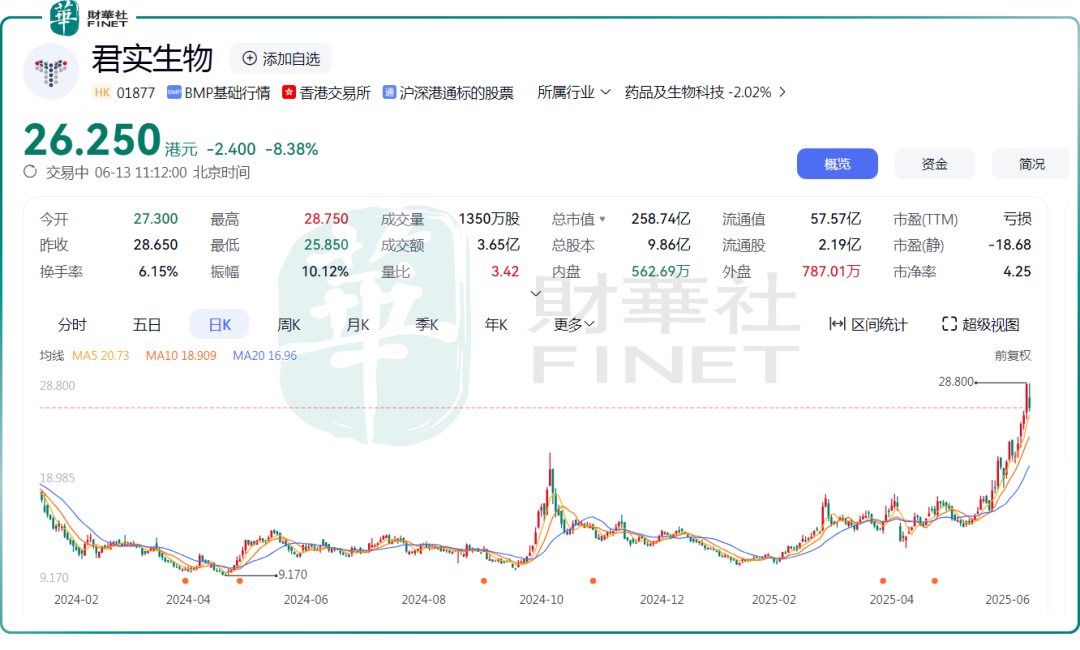 6月13日,伴随着一则配股筹资公告的披露,君实生物(01877.HK;688180.SH)股价从高处下挫,截至发稿其H股下滑9.25%,其A股下跌7.12%。
