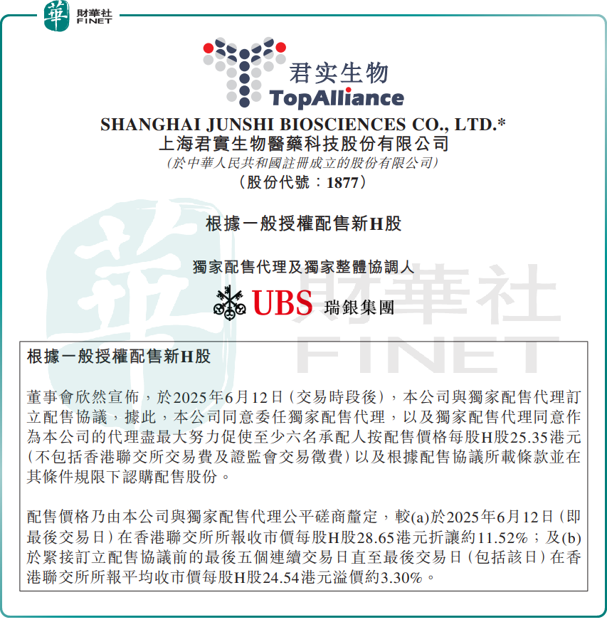 6月13日,君实生物发布公告称,于2025年6月12日,公司与独家配售代理订立配售协议。