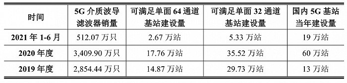 2019年,灿勤科技5G介质波导滤波器销量为2854万只,按每个基站有3面,单面64通道计算,可覆盖14.87万站,当年全国5G基站建设量为13万站,这意味着公司市占率极高。而到2020年,公司5G介质波导滤波器可覆盖17.76万站,当年全国5G基站建设量为60万站,以此推算公司市占率为29.6%。2021年上半年,公司市占率则进一步降至14%。