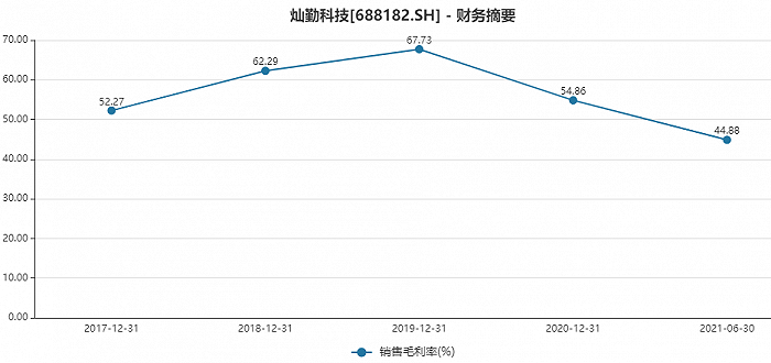 随着产品单价的不断下调,尽管灿勤科技生产工艺和效率有所改进,但毛利率在2020年和2021年连续下滑,从2019年的67.73%下降至2021年上半年的44.88%。
