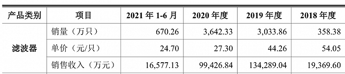 第三是灿勤科技产品单价不断下降。2018年公司滤波器单价为54.05元/只,到2021年上半年,公司滤波器单价已经降至24.7元/只。