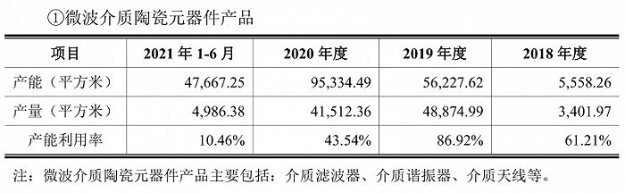 产能利用率下降也是造成灿勤科技毛利率下降的重要原因。公司产能利用率在2019年达到峰值86.92%,2020年产能大幅扩张,产量反而下滑,到2021年公司微波介质陶瓷元器件产品的产能利用率仅为10.46%。